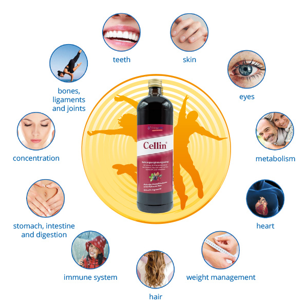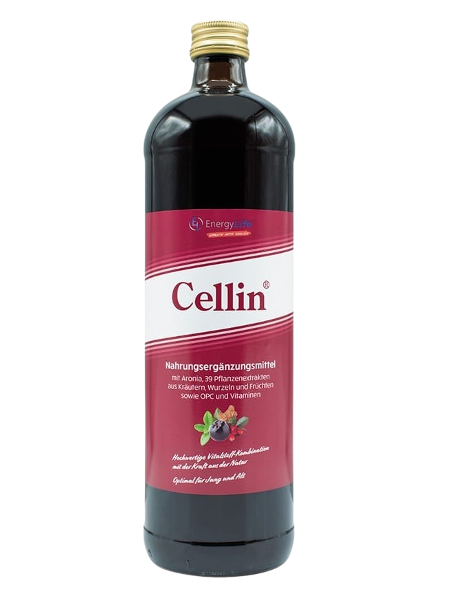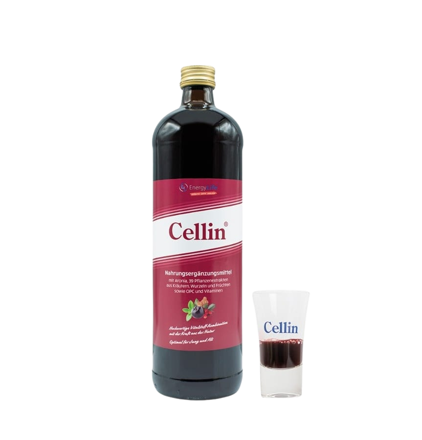 Cellin® is a premium German liquid supplement that combines Aronia concentrate, OPCs and 39 carefully selected plant extracts with essential B-vitamins and vitamin C. One 20-ml dose daily helps cover nutritional gaps, supports daily energy and antioxidant defence — formulated and produced under German quality standards.